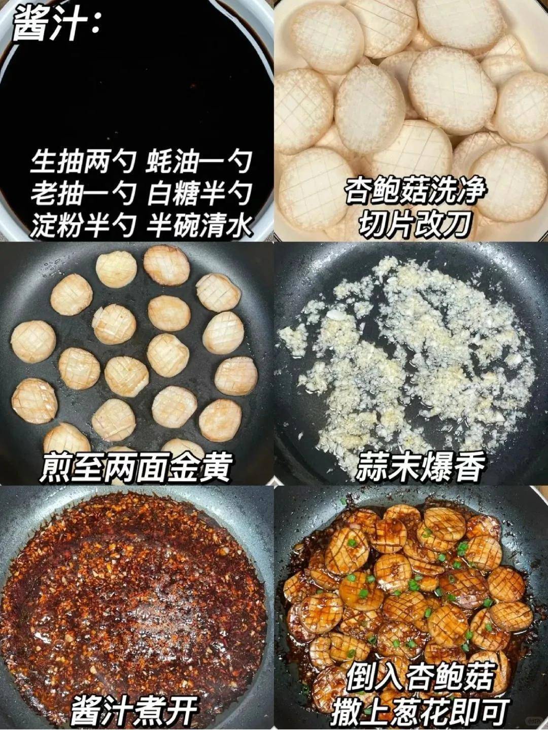 杏鲍菇改刀更容易入味;煎时中小火慢煎,逼出水分更香浓;酱汁煮开再下杏鲍菇,避免糊锅。
