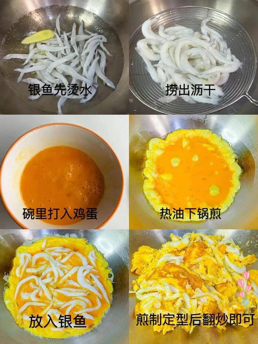 银鱼焯水去腥味;蛋液定型再放银鱼,避免散开;全程中小火,防止煎糊。