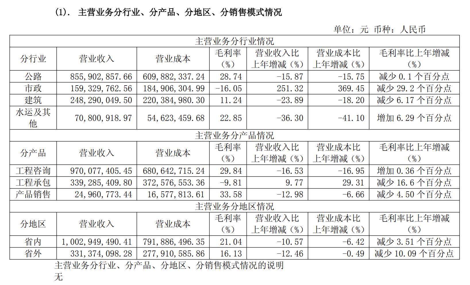 毛利率方面,工程咨询毛利率较上年增加0.36个百分点,值得注意的是,公司另一重要业务工程承包毛利率由正转负,期内为-9.81%,较上年减少16.6个百分点。