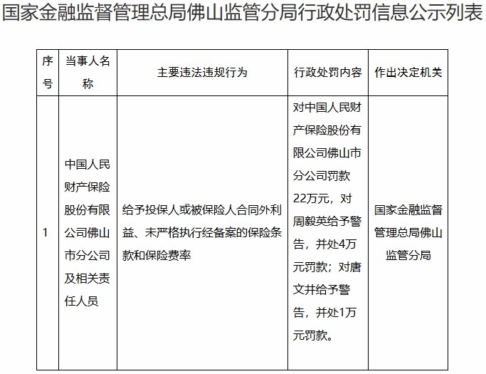 国家金融监督管理总局佛山监管分局对中国人民财产保险股份有限公司佛山市分公司罚款22万元,对周毅英给予警告,并处4万元罚款;对唐文井给予警告,并处1万元罚款。