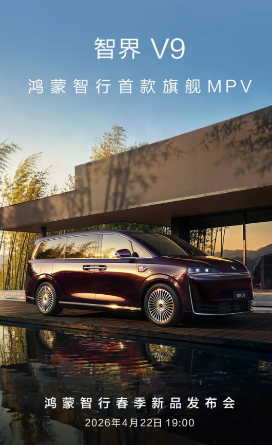 4月15日消息,智界汽车正式官宣智界V9将于4月22日开启预订。
